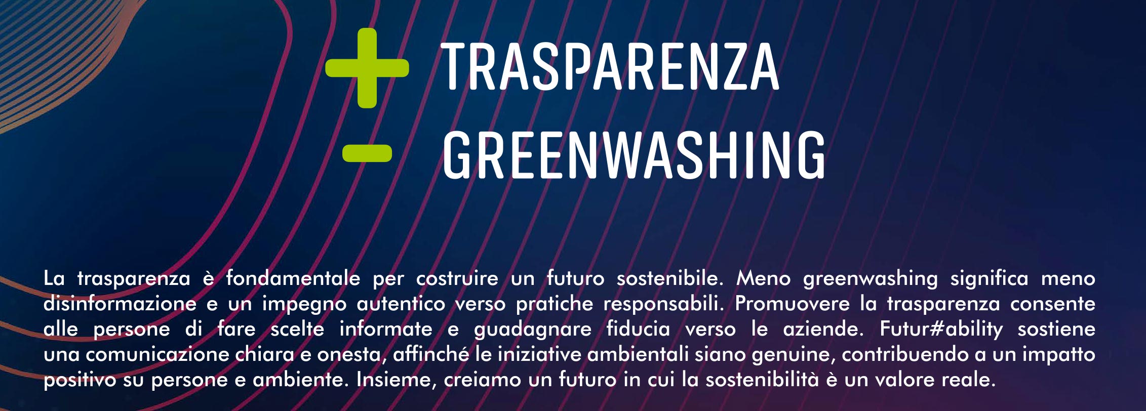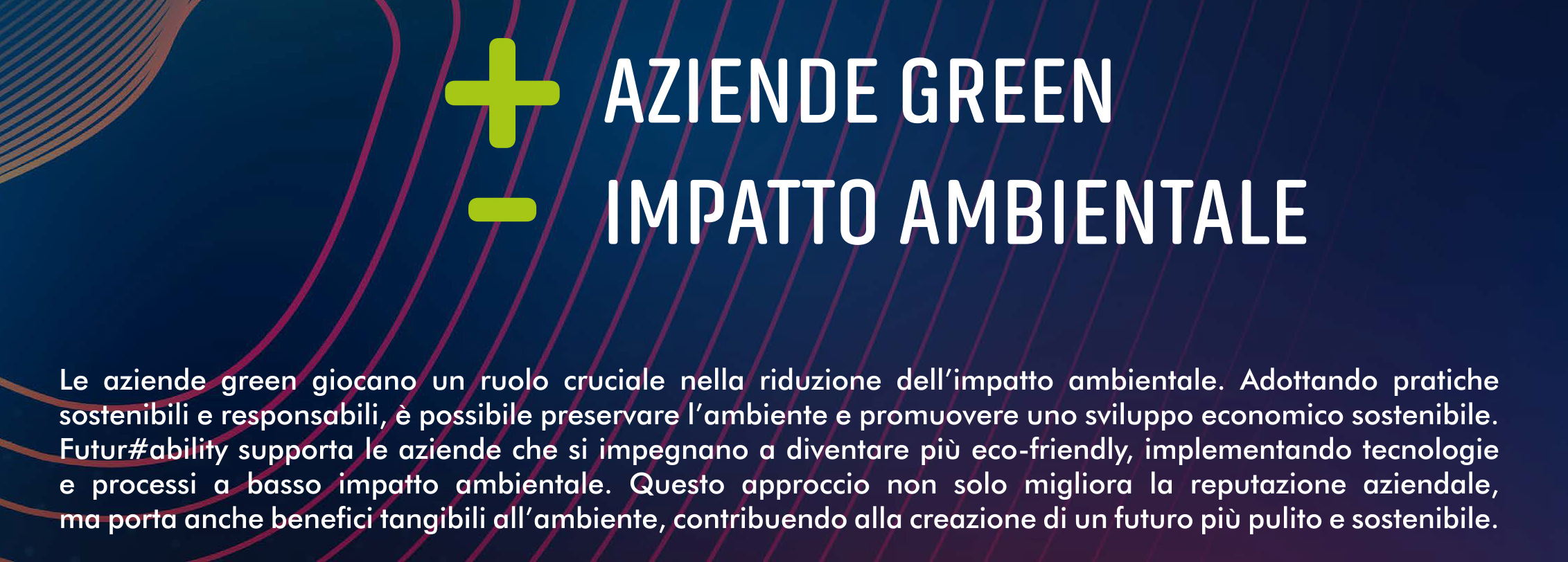 Futur#ability® è accompagnato da un Programma che raccoglie i principi fondamentali del progetto: sostenibilità, valorizzazione delle competenze umane, equilibrio tra innovazione e rispetto per l’ambiente.